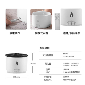來自Volcano的火山精油香薰機,單色黃光款,呈現出仿真水母煙圈火焰的視覺效果,為你的居家空間帶來獨特的氛圍。這款香薰機的產品尺寸為13.8×13.8x10cm,霧量分為兩種模式:20-30ml/h的火焰模式和5-10ml/h的火山模式,能滿足你不同的使用需求。